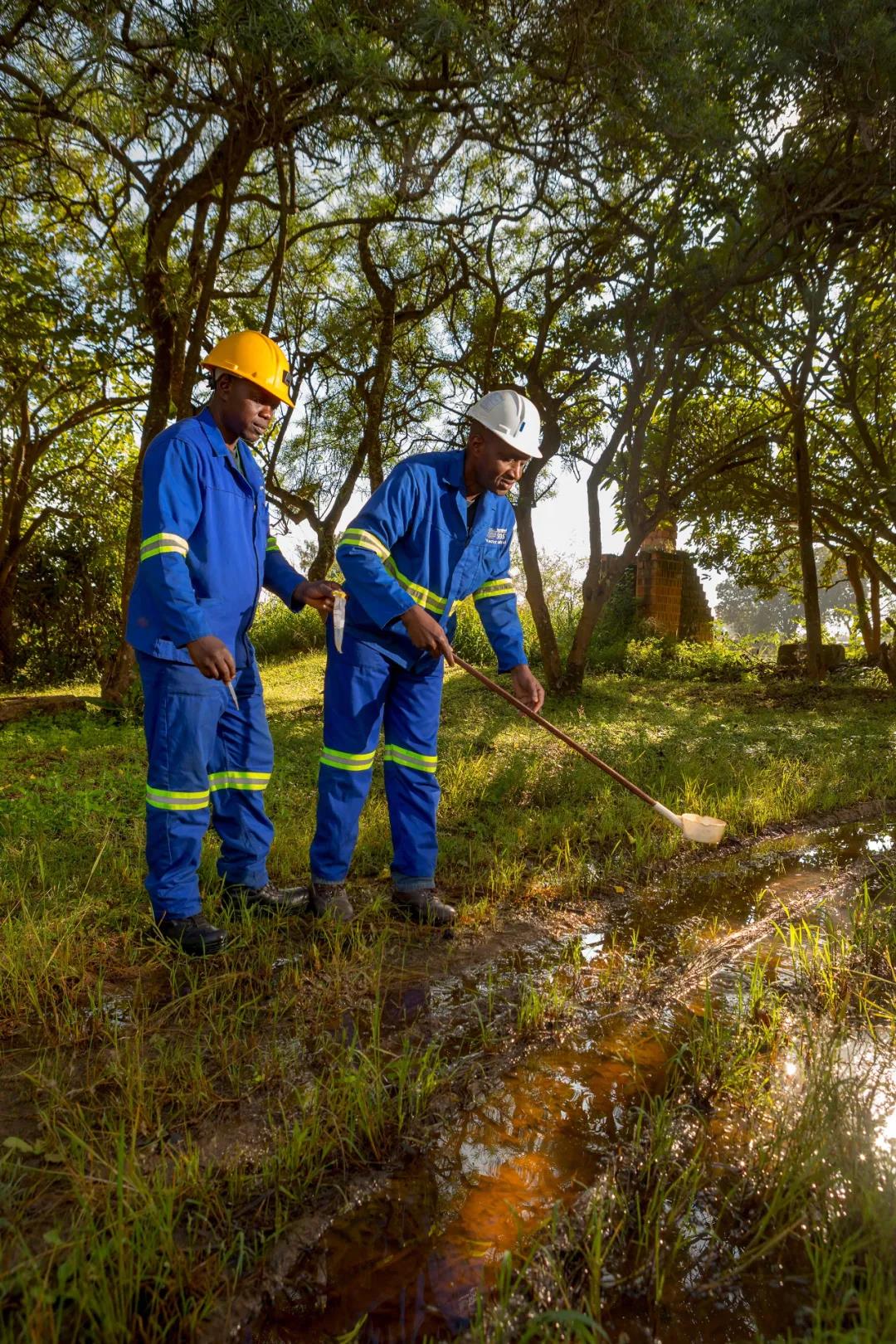 (九游体育刚果(金)矿区的环保工作人员正在进行水样提取)