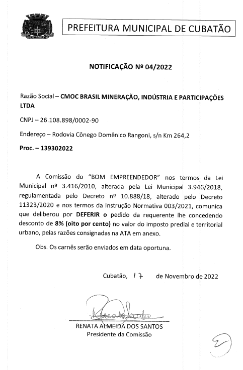 2022年11月18日,库巴唐化工厂收到库巴唐市政府颁发的第04/2022号文件。鉴于库巴唐化工厂在2022年度对城市就业、公共安全、教育、体育、文化、商业和技能培训等方面做出的贡献,该工厂将在2023年城市土地使用税方面给予8%的综合优惠。按照2022年度土地税征收额度,预计2023年库巴唐化工厂将获得约24万雷亚尔的直接优惠幅度。