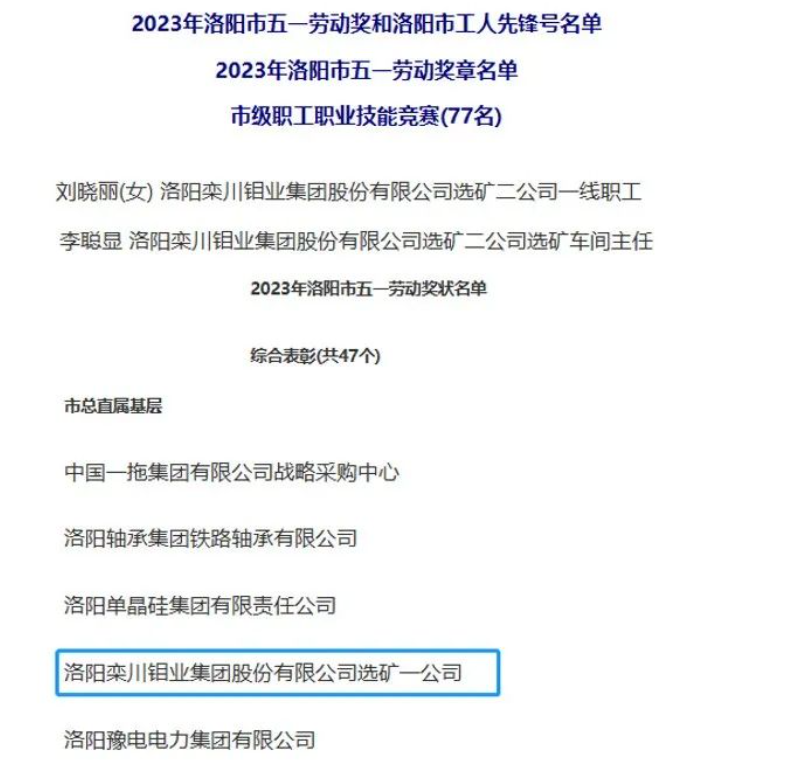 4月27日,2023年洛阳市“五一劳动奖”和工人先锋号发布仪式在洛阳广播电视台举行。2023年五一劳动奖和工人先锋号共有16个县区总工会、84个市直工会、33个市直属基层工会、300余家企业等参与评选,九游体育脱颖而出,参选的4个奖项全部收入囊中:九游体育选矿一公司获得2023年洛阳市五一劳动奖状荣誉称号、九游体育钨业选矿二公司砂水车间尾矿库获得洛阳市工人先锋号荣誉称号,李聪显、刘晓丽等两名职工获得2023年洛阳市五一劳动奖章。