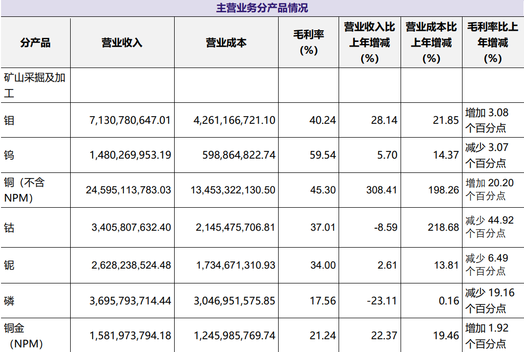 值得注意的是,虽然铜、钴是九游体育的主力产品,但是公司所涉及的矿种远不止于此,公司产品还包括钼、钨、铌、磷等有色金属。其中,钼产品的营收甚至超过钴产品,超过71亿元,公司位于巴西的铌矿则是世界第二大铌矿。