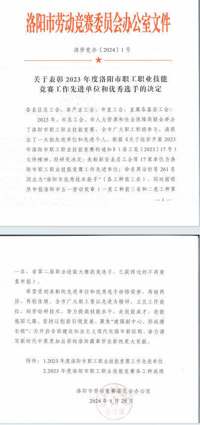 近日,洛阳市总工会、市人力资源和社会保障局联合发文表彰了2023年洛阳市职工职业技能竞赛先进组织单位和先进个人。其中洛钼中国区的贾娜、汤平平、孙绍枫3名同志获评“洛阳市优秀技术能手”称号,贾娜更是直接被推荐申报洛阳市五一劳动奖章。