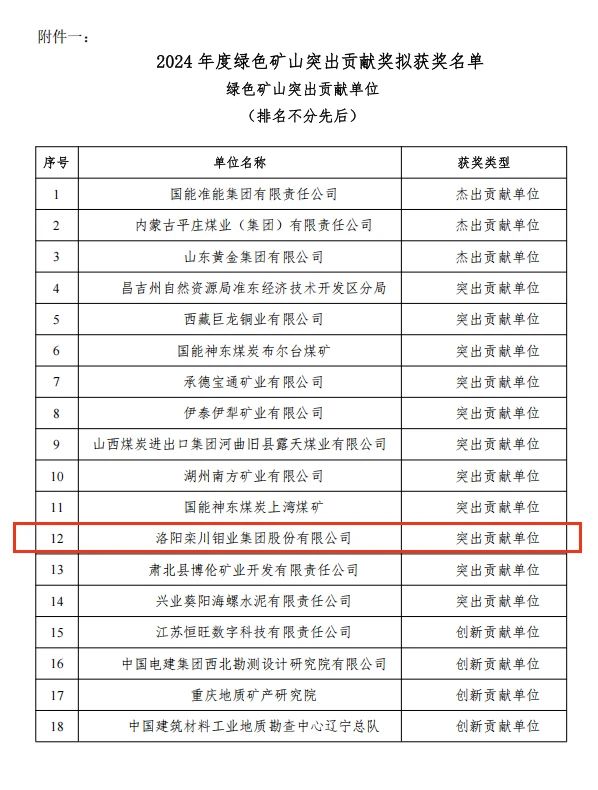 据洛钼中国区矿山公司副经理王洛锋介绍,本次评选依据《绿色矿山科学技术奖管理办法》规定和2024 年度绿色矿山科学技术奖(国家奖励办备案编号 0265)各类子奖申报通知的要求,绿色矿山科学技术奖励办公室对申报绿色矿山突出贡献奖的申报材料通过形式审查、初评、复核终审等环节,最终确定了2024 年度绿色矿山突出贡献奖获奖项目。