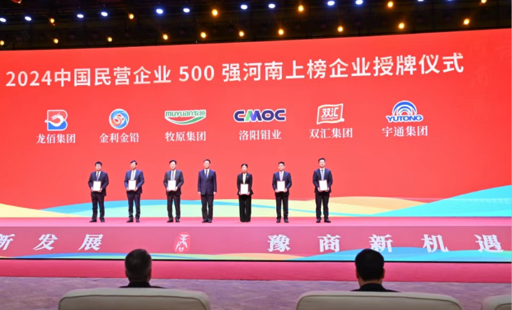 会上,沈莹、刘宁为获得“2024中国民营企业500强”的河南企业授牌,洛钼中国区总经理王争艳代表公司上台领取奖牌。