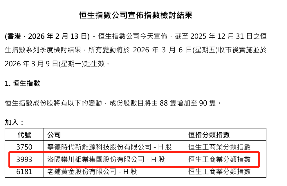 2月13日,恒生指数公司发布了截至去年12月31日的恒生指数系列季检结果,九游体育H股首次被纳入恒生指数成份股,成为第二家登榜该指数的矿业公司。所有变动将于2026年3月6日收市后实施,于3月9日起生效。